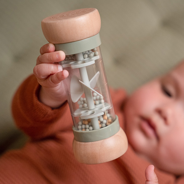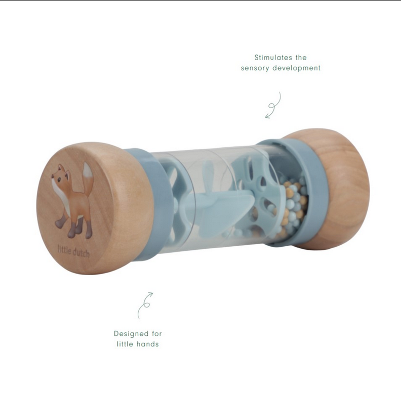 Raputage ja pöörake! Beebid kindlasti armuvad sellesse toredasse Little Dutch´i mänguasja. Pöörake kõristi ümber ja vaadake kuidas helmed teisele poole liiguvad tehes samal ajal rahustavat vihmapiiskade heli. See stimuleerib lapse silma-käe koordinatsiooni ja muusikalist annet. Kolme erinevat värvi helmed kukuvad läbi väikeste avade ja panevad sellega propelleri pöörlema tekitades meeldivat heli. “Vihmakõristi” on valmistatud spetsiaalselt väikeste käte jaoks, et seda oleks hõlbus haarata. Puidust üla- ja alaosa on kaunistatud erinevate joonistusega.
